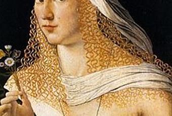 Ce portrait m’intrigue à plus d’un égard. Lucrèce Borgia était, d’après ce qu’on en dit, blonde, représentante de ce fameux blond vénitien. Les cheveux qui dépassent de sa coiffent semblent cependant bien fins, comme artificiels. Le regard de côté a quelque chose de pensif. La tête ornée de feuillage, une petite fleur à la main, un simple médaillon autour du cou et une pierre sur le front, les ornements restent simples, sans ostentation, presque timides. Quand au drapé du costume, il n’est pas sans rappeler les tenues antiques, d’une influence notable à la renaissance, comme en témoigne le sein découvert. Ce qui m’amène à une autre interrogation: là où cette mode célébrait justement les formes féminines, ici on ne peut que constater l’aspect juvénile de cette poitrine. Cela me rappelle que Lucrèce Borgia n’était qu’une adolescente lorsque son père la ballote d’un mariage à un autre (le premier annulé à l’âge de treize ans). Et je ne peux m’empêcher de penser que ce corps d’enfant contraste furieusement avec le visage sage du portrait.
