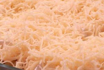Parsemer la surface de morceaux de "fromage carré" (ou camembert) puis de quelques poignées d'emmental râpé.