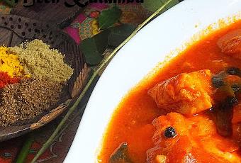 Ingrédients pour 3 personnes3 cuill. à soupe d'huile végétale1 oignon moyen, émincé3 gousses d'ail hachéesMélange d'épices # 1 1 cuill. à thé de grains de poivre noir entiers1/4 cuill. à thé de fenugrec en grains ou moulu1/2 cuill. à thé de fenouil en grains ou moulu1 douzaine de feuilles de cari, lavées et asséchéesMélange d'épices # 21/2 cuill. à thé de curcuma1 cuill. à thé de coriandre1 cuill. à thé de poudre de chili ou de poivre de cayenne3 cuill. à soupe de pâte de tomatesSucre, sel400 g de saumon, en morceaux d'une bouchéeMéthode Dans un poêlon moyen avec couvercle, faire chauffer l'huile à feu moyen. Y faire revenir l'oignon et l'ail, pendant environ 5 minutes, en remuant fréquemment et en prenant soin de ne pas laisser brûler l'ail. Incorporer le mélanges d'épices # 1 et faire revenir 2 à 3 minutes, en mélangeant souvent. Ajouter le mélange d'épices # 2, et mélanger pendant 1 minute. Incorporer ensuite la pâte de tomates. Mélanger. Verser 375 ml (1 1/2 tasse ) d'eau, saler et ajouter une pincée de sucre (pour compenser avec l'acidité de la pâte de tomates). Laisser mijoter mi-couvert pendant une quinzaine de minutes. Goûter et rectifier l'assaisonnement au besoin. À ce stade, la sauce sera assez épaisse, mais le poisson, une fois ajouté rendra de l'eau en cuisant.Ajouter les morceaux de saumon et poursuivre la cuisson à feu moyen-doux, pendant une dizaine de minutes. Servir immédiatement, accompagné de riz blanc (basmati ou jasmin) agrémenté de pois verts. Source : Tous les goûts sont chez Barbara