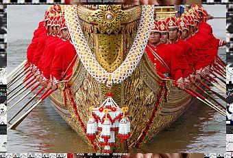 "Vendredi dernier, le fleuve Chao Phraya a été le théâtre d’un spectacle rare, unique, et suivi par un public nombreux : la procession des barges royales. Des barges d'or en forme de cygnes et de créatures marines mythiques, drapées de guirlandes de jasmin, ont glissé sur le fleuve à l'occasion d'une cérémonie vielle de 700 ans, à laquelle plus de 2.000 rameurs ont pris part.L’évènement n’avait pas eu lieu depuis cinq ans. En 60 ans, la procession des 52 barges royales n’avait parcouru le fleuve Chao Phraya à Bangkok qu’à 16 reprises. Les crues de 2011 avait empêché sa tenue. Cette année, la procession s’est bien déroulée. Le 9 novembre entre 15h et 16h, les 52 barges, finement ciselées, ont descendu le fleuve sur 4,5 km du pont Krung Thon Buri au Wat Arun (le temple de l’aube). Le cortège fluvial s’étendait sur 1200 mètres de long et 110 mètres de large. Cette 17e procession a été organisée pour fêter les 85 ans du roi Bhumibol Adulyadej (le 5 décembre prochain), ainsi que la fin de la saison des pluies et du carême bouddhique.