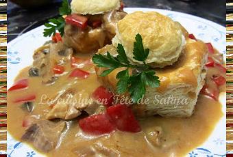 Vol-au-vent au rôti de porc6 vol-au-vent1 c. à table 15 ml d’huile1 c. à table de beurre1 gros oignon en cubes1 piment rouge en cubes6 gros champignons de Paris en morceaux1 enveloppe 47 g de sauce BBQ à l’ail ( Genre St-Hubert )1 tasse 250 ml d’eau1 tasse 250 ml de laitUn reste de 1 lb 454 g de rôti de porc coupé en cubesDans un poêlon, faire chauffer l’huile et le beurre. Ajouter les légumes et faire ramollir. Mélanger le sachet de sauce BBQ dans l’eau avec un fouet et l’ajouter au mélange de légumes. Ajouter doucement le lait et bien mélanger. Ajouter à la fin les cubes de porc seulement pour les réchauffer.Déposer sur les vol-au-vent.Source : SakyaBon appétit!!Sakya