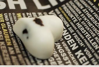 Et puis, une amie à moi, qui a une peau de pèche crânait devant moi avec sa peau douce et son odeur de chocolat. Elle ne m'a fait point de mystère et m'a conseillé de tester les barres de massage Lush : Coeur Tendre (un gros bisou à ma Ptite Pèche, car je sais que tu me lis régulièrement). Ni une, ni deux lors de mon séjour à Berlin, j'ai foncé en boutique et j'ai fais le plein (argh, la facture est tellement moins tendre : 8€45 les 30g). Et là : coup de foudre. Une odeur de cacao, la peau légèrement sucrée, tellement agréable à appliquer (seule ou à deux).