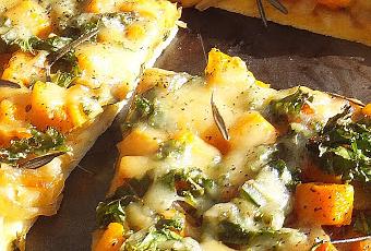 Habitant en Amérique du nord, je vous propose une recette de pizza, donc aux accents italiens, mais pas n'importe laquelle, une pizza végétarienne à la courge, tout à fait originale et goûteuse. Le parfum qui en émane est délicieux, les dés de courge rôtie sont fondants, le chou frisé quant à lui apporte un léger croquant. Et que dire des couleurs, cette pizza est l'essence même de l'automne! Ingrédients pour 1 pizza 1/2 courge musquée (ou butternut), pelée, égrennée et coupée en cubes d'environ 1 cm1 cuill. à thé de romarin frais, haché + quelques brins de romarin 3 cuill. à table d'huile d'oliveSel, Poivre2 gros oignons, finement émincés1,5 tasse (375 ml) de chou frisé (aussi appelé kalé ou borécole), haché1 cuill. à soupe de vinaigre balsamique1 croûte a pizza du commerce100 g de gouda fumé, grossièrement râpé MéthodePréchauffer le four à 200° C (400°F).Préparer la courgeDans un bol moyen, placer les dés de courge, avec le romarin haché et 1 cuill. à soupe d'huile d'olive. Saler légèrement et poivrer, puis mélanger pour bien enrober. Placer sur une plaque à pâtisserie puis faire rôtir au four pendant 30 minutes ou jusqu'à ce que la courge soit tendre. Réserver. Pendant ce temps, préparer les oignons caramélisés et le chou friséFaire chauffer 1 cuill. à soupe d'huile d'olive dans une poêle en fonte ou antiadhésive, à feu doux. Ajouter les oignons et une pincée de sel, puis faire cuire en remuant fréquemment, jusqu'à ce que les oignons soient caramélisés, soit environ 30 minutes.Entre temps, combiner le chou frisé et le vinaigre balsamique dans un bol. Réserver.Montage et cuissonPréchauffer le four à la température indiquée sur l'emballage de la croûte à pizza. Placer la croûte sur une plaque à pâtisserie.Dans un petit bol ou un mortier, mettre une cuill. à soupe d'huile d'olive et quelques brins de romarin. Écraser à l'aide d'un pilon pour extraire l'arôme du romarin. Étendre sur la croûte à l'aide d'un pinceau. Répartir uniformément les oignons caramélisés sur la croûte, puis les dés de courge, et le chou frisé. Terminer par le gouda fumé et parsemer des brins de romarin utilisés pour l'huile. Faire cuire 8 minutes ou jusqu'à ce que le fromage soit complètement fondu. Servir immédiatement.Notes *Si vous voulez vous épargner l'étape consistant à faire rôtir la courge, la veille au soir, placez les dés de courge dans un bol moyen, remplissez d'eau froide et salez. Couvrez et conservez au réfrigérateur toute une nuit.*Vous pouvez également réaliser cette pizza sur une pita de blé entier ou un pain naan.* Le romarin peut être remplacé par de la sauge. Dans ce cas allez-y avec parcimonie car la sauge à un arôme et un goût assez prononcés.*Le gouda fumé peut être remplacé par du fontina ou de la mozarella.Adapté de : Closet cooking.com Ohmyveggies.com Allrecipes.com