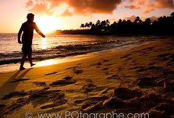 Silhouetted walker on Poipu beach at sunset, Kauai, Hawaii