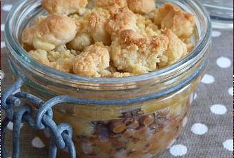 Dans un ramequin allant au four, déposez deux à trois cuillères à soupe de lentilles, recouvrez ensuite de pâte à crumble.