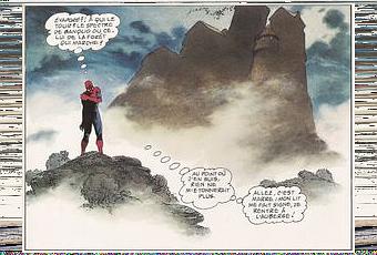 Parker ne revêt le costume de l'araignée que page 16, et s'en fuit par les toits en ardoise des petites maisons du village, avant de se retrouver nigaud en pleine lande, bien embêté de ne pouvoir lancer sa toile. (la case en moins). Mais il ne perd pas son humour légendaire. Citation : "Tsss jamais d'arrêt de bus quand il en faudrait" ... Ras l'bol d'arpenter la bruyère"