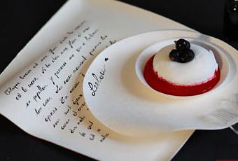 Pour cette année, je vous propose un petit dessert poétique, comme un joli cadeau raffiné. L’idée m’est venue de notre jolie assiette biodégradable « wave », comme une feuille de papier encore vibrante sous le message tendre d’un soupirant. C’est donc des citations d’amour d’inconnus que j’ai pris la peine de calligraphier sur cette page de canne à sucre. Ne pas oublier les liés et déliés pour donner du caractère à votre lettre d’amour.