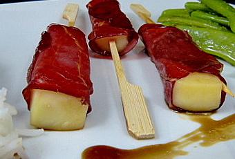 Pour les yakitoris, préparer la marinade en chauffant la sauce soja, le miel et le vin blanc. La faire réduire un peu. Badigeonner les tranches de breaola avec la sauce. Laisser mariner quelques minutes. Pendant ce temps, tailler le fromage et les enrouler dans chaque tranche de bresaola.