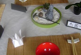 Voici la table dressée pour un repas sur le thème de l'Asie. J'ai opté pour une déco sobre et épurée dans les tons rouge-noir blanc