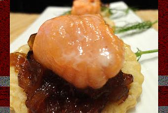 Voici de petits feuilletés à base d'oignons caramélisés et de pavé de saumon, un vrai régal.On peut les déguster en entrée ou à l'apéro.le duo saumon/oignon rien à dire....un pur bonheur!