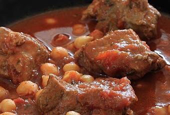 pour 6 personnes : 1 épaule d'agneau désossée de 1,2 kg environ 1 cuil à soupe d'huile d'olive 1 cuil à soupe de cumin moulu 1 cuil à soupe de paprika 1 bâton de cannelle 1 boite de tomates concassées 2 branches de thym frais . 1/2 cube de bouillon de volaille 1 boite de pois chiches (facultatif)