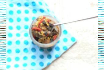3 cs de son de riz - 1 cs de protéines de chanvre - 1 cs de cacao dégraissé - 1 cs de sucre muscovado - 1 cc de beurre de cacao - 1/2 verre de lait (végétal ou de vache Bio) - 1 belle cs de mélange super fruits Fructivia
