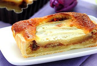 Etaler la pâte dans le moule rectangulaire. Piquer la pâte. Etaler une fine couche de crème d'amandes.Faire fondre le praliné au bain marie . L'étaler par dessus la crème d'amandes.