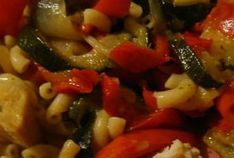 Puis mettre de côté le poulet. Ajoutez dans la même poêle les 4 courgettes coupées en petites rondelles et 2 poivrons rouges émincés.