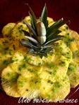 Choisissez un ananas bien mur. Coupez les extrémités et retirez la peau extérieure. Coupez en lamelles très fines les tranches d’ananas (comme un carpaccio) et posez les sur un grand plat. Dans un petit mixer, mélanger le sucre et les feuilles de basilic (au passage, profitez de l’odeur du basilic broyé…moi j’adore!). Versez le jus du citron et saupoudrez le sucre/basilic. Laissez mariner au moins 1/2 heure.