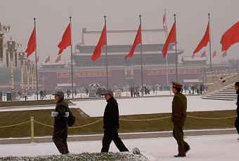 Poursuite de mon patchwork chinois, cette fois les 22 et 23 décembre 2004Noël est proche, plus que trois jours à attendre. Même si cette fête ne fait partie ni de la religion, ni de la culture chinoises, les rues de Pékin se sont quand même habillées pour la fête.Mais, ici sur la place Tiananmen, rien ne transparaît de ces festivités. Le blanc de la neige souligne le rouge de drapeaux. A l’arrière-plan, coiffant l’entrée de la Cité interdite, trône toujours un portrait géant de Mao, rappel de l’empereur rouge disparu, qui, au contraire de Staline en Russie, n’a pas été déboulonné de l’iconographie officielle.