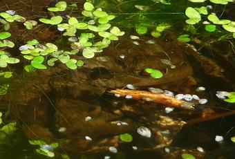 L’an dernier, les crapauds avaient commencé leurs aventures reproductrices en mars, je m’en souviens bien : les jardiniers du Jardin Public de Bordeaux avaient aménagé des crapauducs pour que les batraciens puissent rejoindre la mare pour leurs ébats. Hier, j’aperçois des points rouges atypiques dans l’échantillon de rizière du jardin botanique : des yeux de crapaud. Avec madame. Regardez bien, regardez mieux :