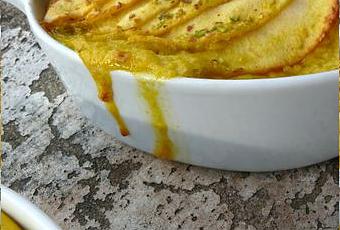 Un gratin de pommes parfumé au rhum et à la poudre de pistache qu'on pourrait remplacer par de la poudre d'amande.