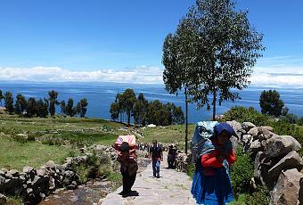 A l'origine, nous comptions passer une nuit sur la tranquille île de Taquile, mais le destin (sous forme de ferry capricieux, cf post précédent), en a décidé autrement... Nous avons dû nous rabattre sur l'excursion à la journée à partir de Punos, autrement dit : nous n'avons rien vu. 3 heures de bateau à l'aller (avec arrêt aux Uros), autant au retour... et seulement 2h30 sur place, sachant qu'en plus il fallait s'arrêter déjeuner. Nous avons tout juste eu le temps de monter la colline d'un côté, de manger au sommet et de la redescendre par l'autre côté. Et ce sans lâcher le groupe du bateau, sinon on aurait risqué de louper le retour. Le moins qu'on puisse dire, c'est que ça monte dur ! Nous en bavions déjà avec rien sur le dos, alors que dire des autochtones chargés comme des mules en ce dimanche, jour du seigneur mais surtout du ravitaillement.