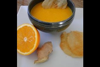 Une super recette pour bien commencer un repas : un velouté de carottes avec du gingembre et du miel et un jus d’orange pour finir.