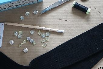 Pour cela il vous faut, des chaussettes (on a toutes une paire de chaussettes au fond du placard inutilisée, au pire prenez celles du chéri), des strass ou des boutons -les miens viennent de Ma Petite Mercerie, ma mercerie on line préférée- du fil, des ciseaux et puis c'est tout.