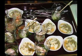 Les mises en bouche se sont composées d'un tartare de homard au wasabi, sauce sésame et huile de truffe, d'un carpaccio de flétan aux fruits de la passion, de langoustines rôties, sur une crème de céleri et coulis de cresson.