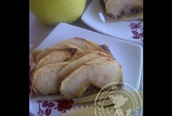 Étaler votre pâte (ici je lui ai donné la forme rectangulaire), recouvrir de compotée d’oignons et de pommes épluchées et finement tranchées