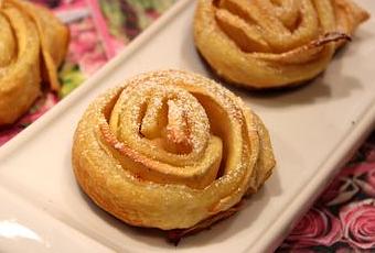 Découpez des bandelettes de 1.5 cm d'épaisseur dans la pâte. Disposez les lamelles de pommes sur les bandelettes en les chevauchant. Enrouler chaque bandelette sur elle-même d’un bout à l’autre, d’une manière à obtenir une petite rose.