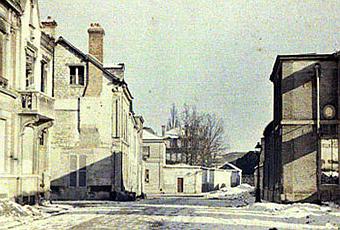 Les deux maisons de gauche n'ont pas trop souffert ; je suis née en 1946 dans la maison en brique. Le bâtiment qui se trouve juste après, au coin de la rue du Général Baratier avec un petit bosquet, abritait, jusque dans les années 1970, la première clinique des Bleuets.