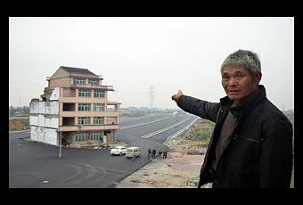 Les voitures circulant à grande vitesse doivent contourner l'immeuble et Luo et son épouse refusent de quitter l'immeuble car la compensation offerte ne leur paraît pas suffisante. Les autres locataires sont déjà tous partis.