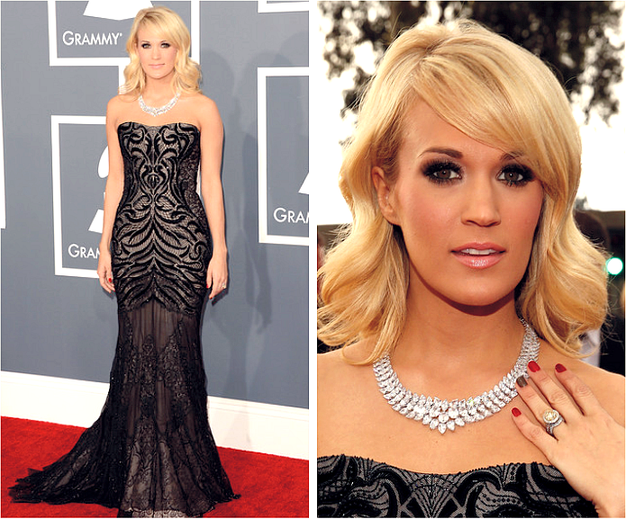 ♡ Carrie Underwood en Roberto Cavalli. Comme à son habitude je l'ai trouvé très gracieuse et puis avec une robe signée par cette maison, il était difficile de faire un flop selon moi. Pour info, le collier de diamants est signé Johnathon Arndt. Doté de quelque 381 carats de pierres précieuses, le prix de ce collier s'élève donc à la modique somme de 31 millions de dollars ! Il peut bien briller n'est-ce pas ?!