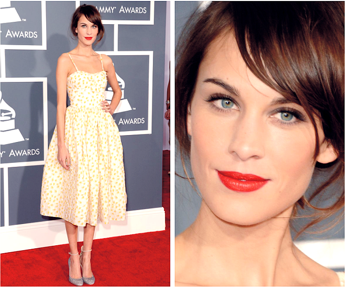 ♡ Alexa Chung en Valentino Red. Moi même je suis surprise mais j'aime beaucoup le look d'Alexa aujourd'hui. Je trouve que cette petite robe imprimée (les imprimés sont des petits soleils) lui va à ravir et puis son makeup est à tomber par terre ! Il lui fait ressortir ses yeux, on dirait une poupée ! Vogue nous fait aussi remarquer que côté beauté, Alexa avait opté pour une manucure pailletée argent en accord avec ses chaussures.