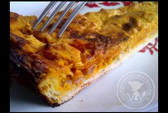 Étaler la pâte dans votre moule à tarte siliconée, piquez la, recouvrir de morceaux de potiron restant et de jambon. . Napper du lait au potiron et enfourner à 200°C pendant au moins 30mn