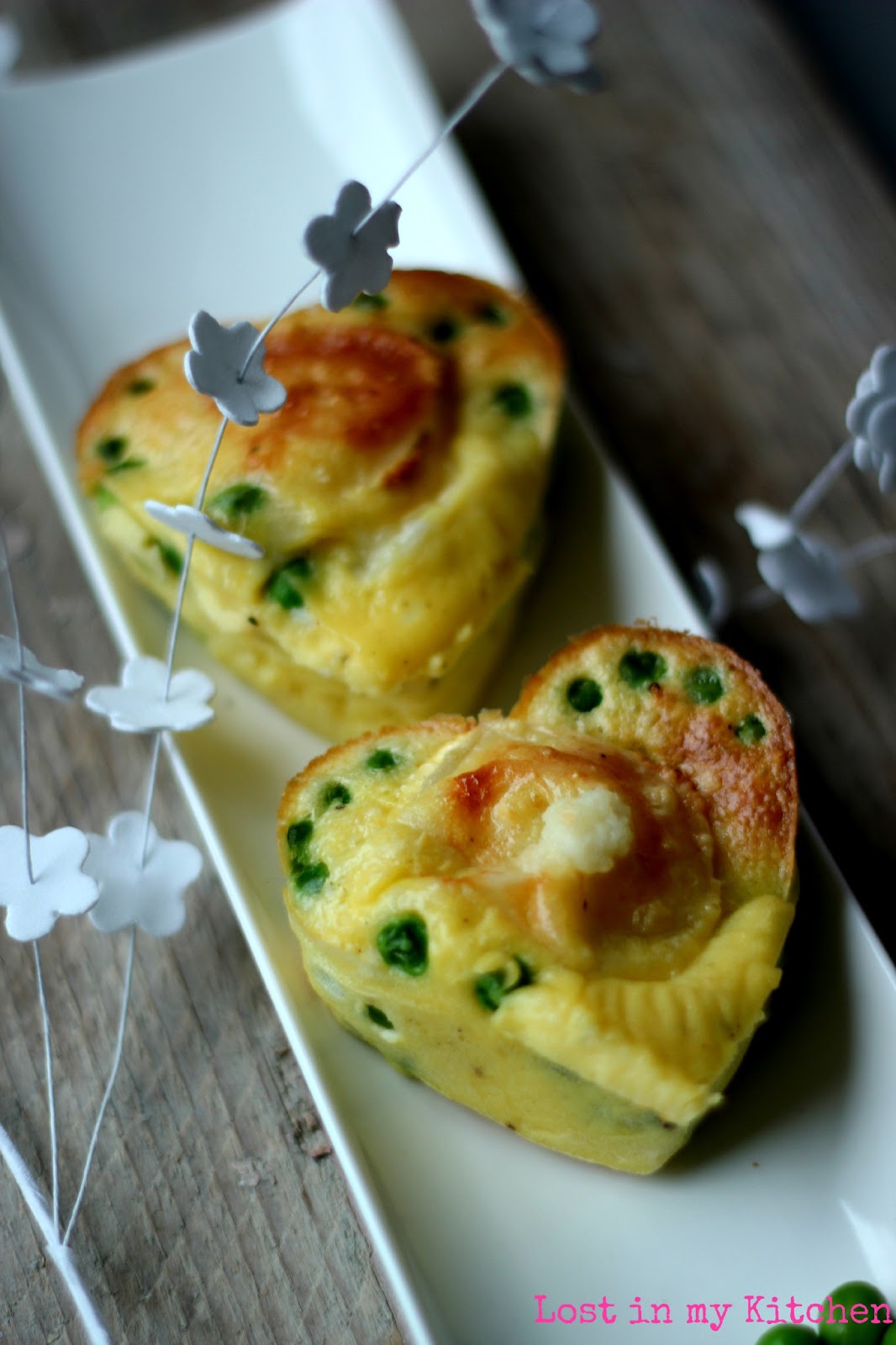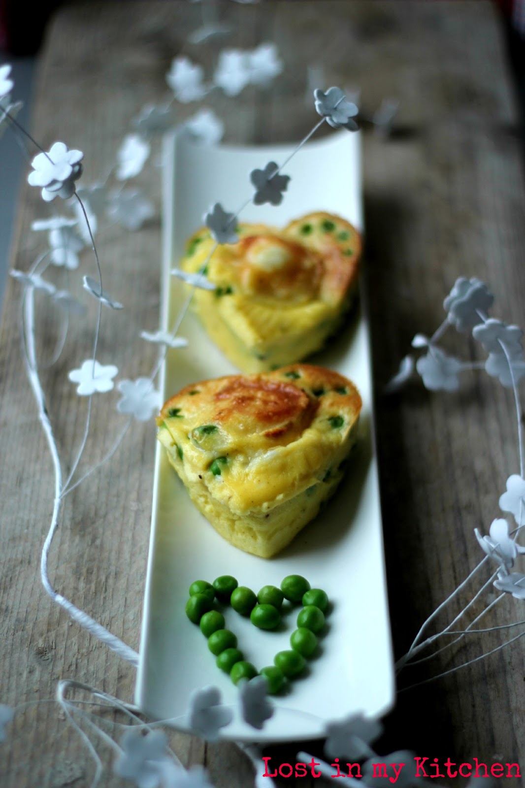 A l'aide de moules en silicone en forme de cœur, voici une entrée à partager encore à deux. Sur une base de quiche, j'y ai ajouté des petits pois et une tranche de chèvre au centre.