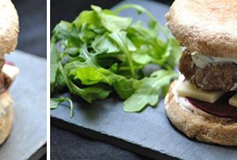Ingrédients pour 4 personnes : 4 muffins à la farine complète (sous vide au rayon pain de mie) 3 tranches de gigot d'agneau 1/2 cuillère à café de cumin en poudre 1 pincée de cannelle 1 bouquet de menthe 1 briquette de crème liquide entière 1 petite betterave crue 1 morceau de comté roquette sel, poivre, huile d'olive.