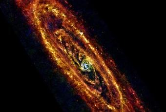 L’observatoire spatial Herschel, une mission de l’Agence Spatiale Européenne (ASE) avec une contribution importante de la part de la NASA, perçoit les plus grandes longueurs d’onde de la lumière infrarouge de la galaxie, révélant ses anneaux de poussière froide. Certaines de ces poussières sont les plus froides de la galaxie, de seulement quelques dizaines de degrés au-dessus du zéro absolu. Dans cette nouvelle vision de la galaxie d’Andromède à partir du télescope spatial Herschel, les pistes fraiches d’étoiles en formation sont révélées dans les moindres détails.