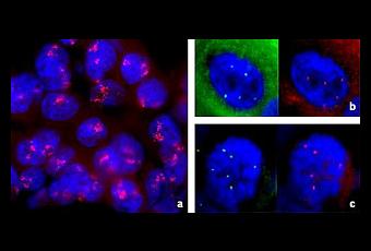 FISH HER2 (signaux rouges) sur coupes de deux tumeurs incluses en paraffine. (a): tumeur montrant une amplification; noter la disposition des signaux en amas. (b,c): tumeur montrant une surreprésentation. (b): noyau interphasique. à g. signaux centromériques du 17 (vert), à d. signaux HER2 (rouge); 4-5 signaux sont visibles, avec un rapport HER2 par centromère 17 proche de 1. (c): métaphase de la même tumeur, montrant une colocalisation des signaux HER2 (à d., en rouge) et centromériques (à g., en vert), confirmant que la surreprésentation de HER2 est liée à une polysomie 17. In Pathologie Biologie Volume 56, Issue 6, September 2008, Pages 375-379