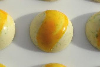 Ces demi-sphères colorées en jaune et mouchetées de vert sont garnies d'une ganache au gingembre et citron vert. Comme base de la ganache, j'ai utilisé du chocolat Zéphyr ; le nouveau chocolat blanc de Cacao Barry qui contient plus de beurre de cacao et moins de sucre. Une belle découverte faite au Salon du chocolat ce week end.
