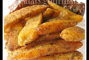 Préchauffer le four à 400°(200°), tapisser de papier parchemin une grande plaque à biscuits, réserver. Dans un bol, mettre les frites, l'huile et les épices et bien mélanger le tout jusqu'à ce que les frites soient bien enrober. Mettre en une seule couche sur la plaque, mettre sur la grille du bas et cuire environs une quarantaine de minutes, en retournant les frites à mi-cuisson. Si désiré, passez sous le broil pour un peu plus de croustillant, mais attention pour pas qu'elles brûlent.