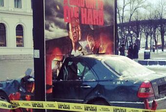 Une installation de street marketing avec une véritable voiture en ce moment à Oslo (Norvège) pour la promotion du film DIE HARD : BELLE JOURNEE POUR MOURIR.