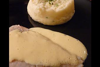 Il ne reste plus qu'à dresser (il faut garder au chaud la purée et le sabayon le temps de cuire le poisson) : un filet de turbot, arrosé de sabayon au vin blanc avec à côté l'écrasé de pommes de terre à l'estragon.