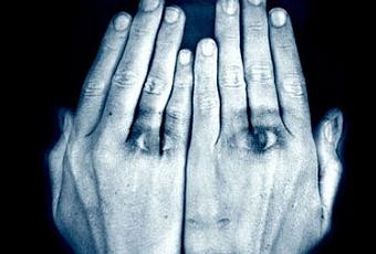 Les visages apparaissent subtilement, comme en double exposition, en transparence, à travers les mains.