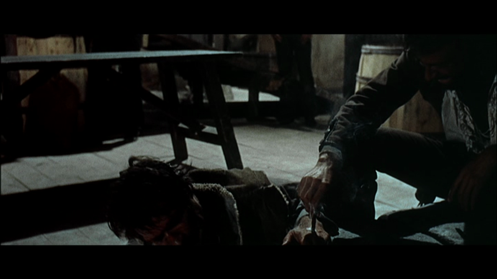 On prend le passage à tabac américain, on lui rajoute le double de longueur, des rires particulièrement sadiques, des blessures graphiques, et des conséquences longues et douloureuses. L'homme sans nom rampe, se traîne avec une lenteur désespérante, met des semaines à s'en remettre, est quasiment mort. Mais il lui reste le regard, la force de l'âme, ce regard quand il a écrasé Mario Brega, ce regard que même John Wayne n'a pas.