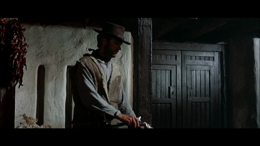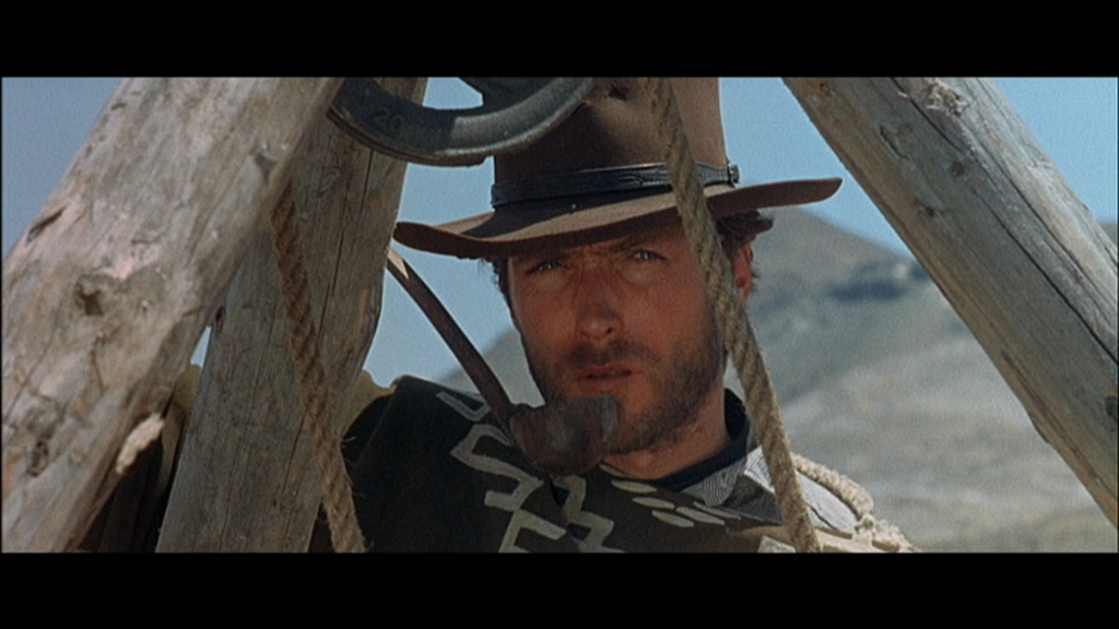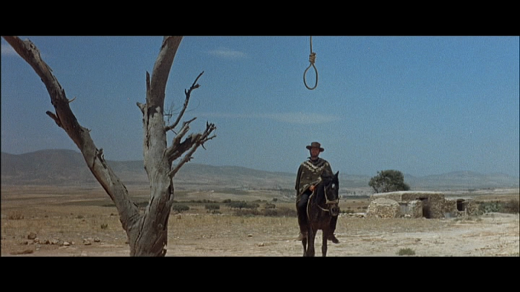 Curieusement, je ne m'étais jamais demandé pourquoi l'homme sans nom arrive sur une mule. Le scénario lève le voile là-dessus: l'homme sans nom est en fait un soldat confédéré en fuite, qui a volé le poncho et la mule d'un péon après avoir traversé le Rio Grande. On peut faire ce que l'on veut de cette information, elle n'appartient pas au film, elle ne fait que dévoiler que le film n'est peut-être pas tout à fait celui qui était prévu au départ. Elle jette aussi un doute sur les dires de l'acteur qui affirme avoir eu l'idée du poncho. Tout comme l'on peut faire ce que l'on veut du prologue tourné par les américains pour "justifier" les actions du héros. Tout ça c'est du contexte, ce qui importe, c'est que Clint Eastwood arrive sur une mule, et qu'à cause de ça, quatre gars vont y passer.