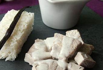 Dans une casserole, versez le lait de coco (400ml) avec une gousse de vanille gratée de sa pulpe ainsi que les arêtes préalablement réservées.