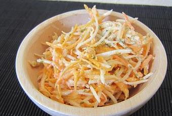 Une autre recette trouvée dans le livre "Les légumes oubliés" : celle du coleslaw qui mélange différents légumes râpés avec de la mayonnaise. Dans cette version, le chou blanc est remplacé par des variétés de légumes anciens qu'on a peu l'habitude de cuisiner cru mais qui sont pourtant excellents : navet, butternut et persil tubéreux. Une bonne façon de consommer des crudités en plein hiver.