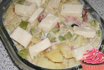 mettre les légumes dans un plat, saler, poivrer ajouter le mélange creme oignon bacon, mélanger.