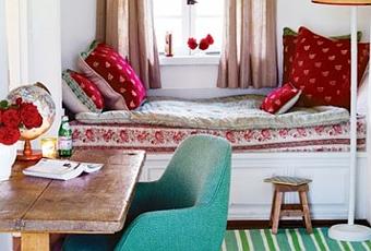 Aujourd’hui j’avais envie de vous proposer un coin de lecture à la fois simple et coloré. Un pièce qui vous donne envie d’y être et surtout qui a le don de vous mettre de bonne humeur. En cherchant sur le net quelque chose pour vous, je suis tombée sur cette photo et je trouve qu’elle correspondait à mes critères du jour. Toute l’ambiance me fait penser à un petit cocon duquel on ne voudrait jamais sortir ou bien, à une maison de campagne avec une pointe de décoration un peu anglaise. J’aime le mélange des couleurs et des différents tissus. La banquette a l’air incroyablement confortable. Qu’en pensez-vous?