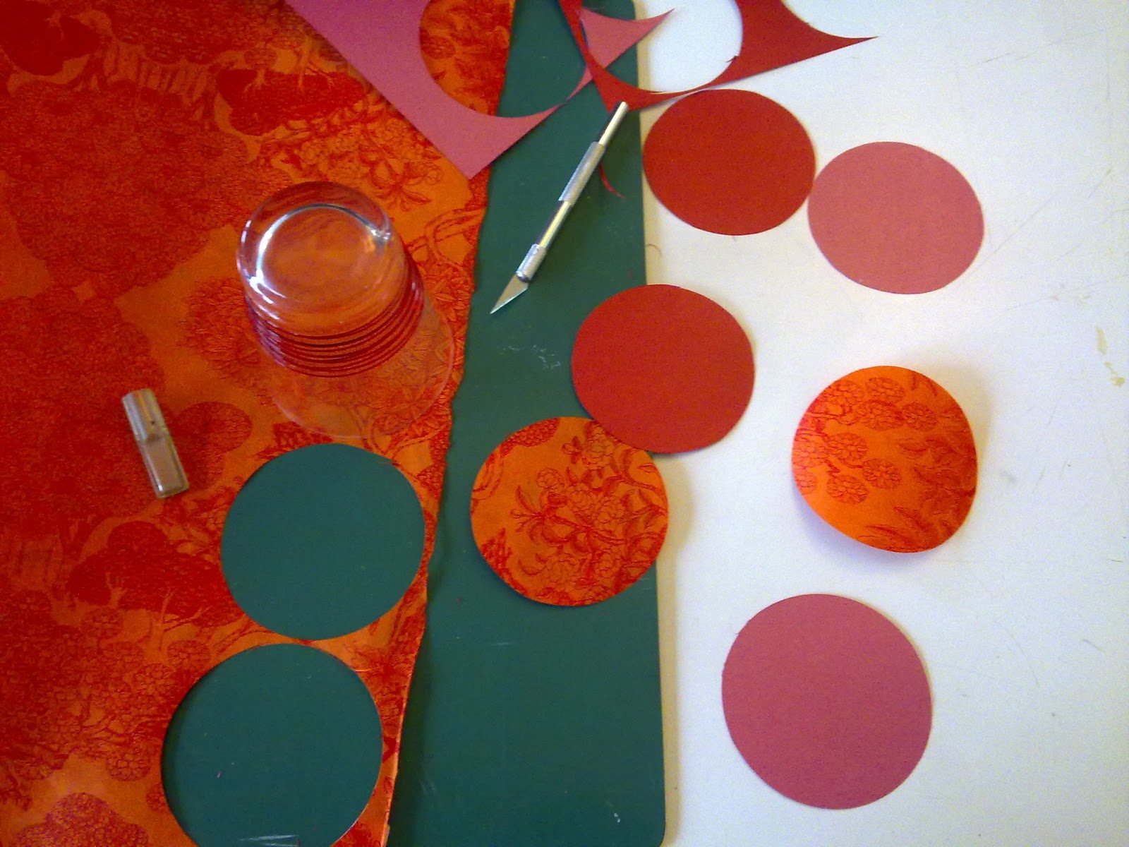 -du papier coloré, ici quelques feuilles de papier brillant rose et rouge ainsi qu'une très belle feuille de papier à motifs orangé pour faire ses cercles de papier (ici 28)