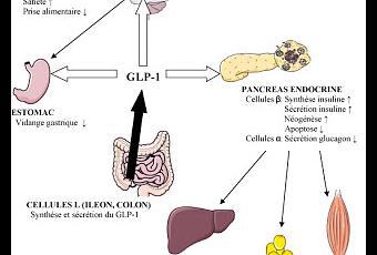 Actions physiologiques du GLP-1. SNC: système nerveux central; PHG: production hépatique de glucose. Les flèches verticales courtes pointant vers le bas indiquent une inhibition ou une diminution; les flèches verticales courtes pointant vers le haut indiquent une stimulation ou une augmentation. Les flèches vides épaisses indiquent une action directe du GLP-1 produit par des cellules spécifiques de l'iléon et du colon vers ses tissus cibles, à savoir l'estomac, le système nerveux central et le pancréas endocrine. Les flèches fines "longues" indiquent un effet indirect du GLP-1 vers ses autres tissus cibles, à savoir foie, tissu adipeux et muscle. In Nutrition Clinique et Métabolisme Volume 22, Issue 2, June 2008, Pages 59-65